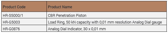Supplied complete with 50 kNLoad Ring, 30 x 0,01 mm Analog Dial Indicator and CBR Penetration Piston.