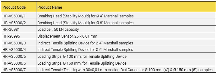 Breaking Head (Stability Mould) for Ø 6" Marshall samples, Indirect Tensile Splitting Device for Ø 4" Marshall samples, Indirect Tensile Splitting Device for Ø 6" Marshall samples, Loading Strips, Ø 100 mm, for Tensile Splitting Device, Loading Strips, Ø 160 mm, for Tensile Splitting Device and Indirect Tensile Test Jig for Compacted Bituminous Sampleswith 25x0,01 mm Analog Dial Gauge for Ø 100 mm (4”) & Ø 150 mm (6”) samples should be ordered separately.