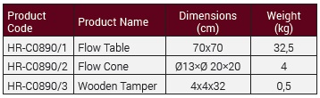 The apparatus consists of a double steel table, the upper table measuring 700x700 mm and hinged at one side to the lower table. The top table is inscribed and all parts are protected against corrosion. The stainless steel cone has a top ∅ 130 mm, base ∅ 200 mm, 200 mm high and 1.5 mm thickness. Dimension of wooden tamper is 40x40x200 mm and its holder is 120 mm.