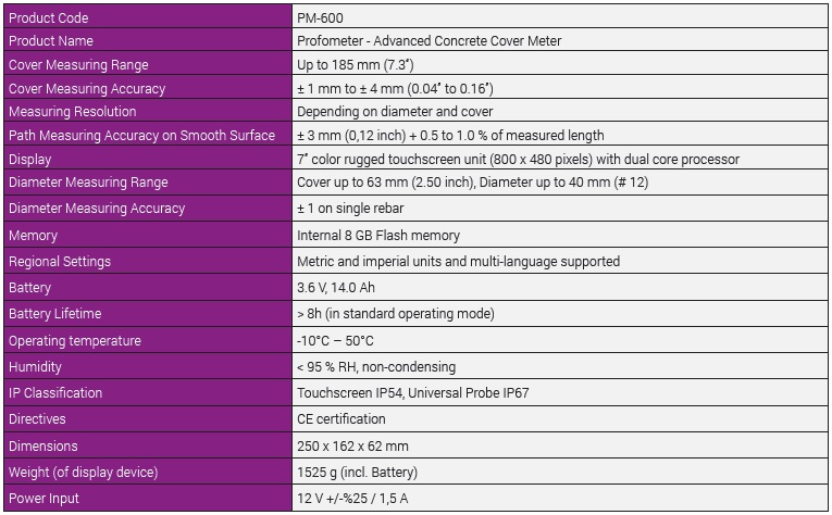 The Profometer PM-600 is an Advanced Cover Meter for the precise and non-destructive measurement of concrete cover and rebar diameters and the detection of rebar locations using the eddy current principle with pulse induction as the measuring method.