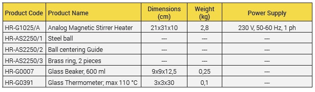 Supplied complete with a hotplate with magnetic stirrer, 2 steel balls, ball centering guide, 2 brass rings, 600 ml glass beaker and max. 110 °Cthermometer.