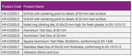 EN 1015-12, EN 1348, EN 1542, EN 13693, EN 14496, ASTM C1583, ASTM D4541, ASTM D7522, ASTM D7234, BS 1881 Part 207, DIN 1048 Part 2