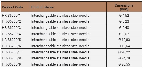 Complete with 9 interchangeable stainless steel needles Ø 4,52- 5,23 - 6,40 - 9,07 - 12,83 - 16,54 - 20, 22 - 24,79 - 28,55 mm, accessories, carrying case.