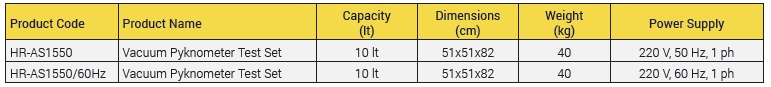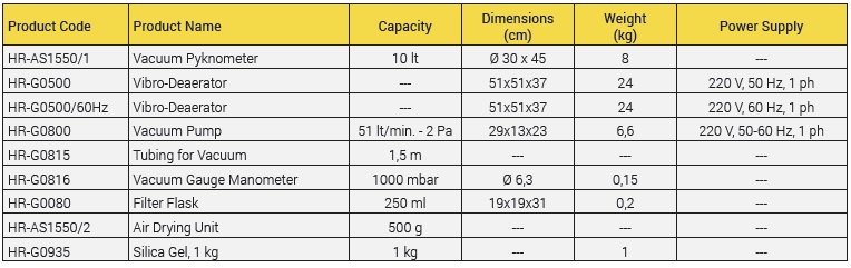 Complete With Vacuum Pycnometer, Vibro-Deaerator, Vacuum Pump,1,5 m tubing for vacuum, Vacuum Gauge and Filter Flask 250 ml.