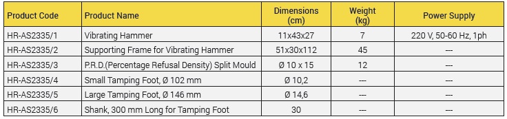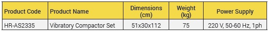 The HR-AS2335 Vibratory Compactor Set consists of a Vibrating Hammer, Supporting Frame, Small and Large Tamping Foots and 300 mm Shank.